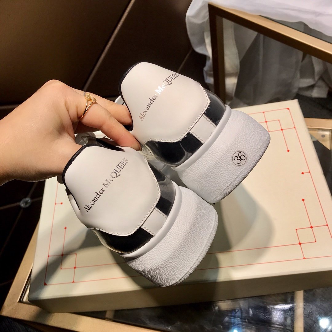 Sneakers allacciate in pelle bianca liscia con punta arrotondata e dettaglio in pelle bianca sul tallone. Lacci larghi piatti e logo Alexander McQueen sulla linguetta e sul tallone. Suola oversize in gomma.
